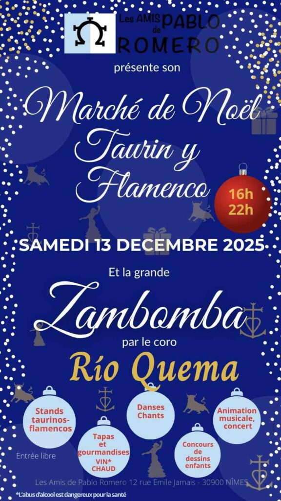 Le samedi 13 décembre 2025 de 16h à 22h, venez au Marché de Noël taurin y flamenco, participez à la Zambomba et dessinez (petit artiste de 4 à 12 ans) de participer au concours de dessin.
