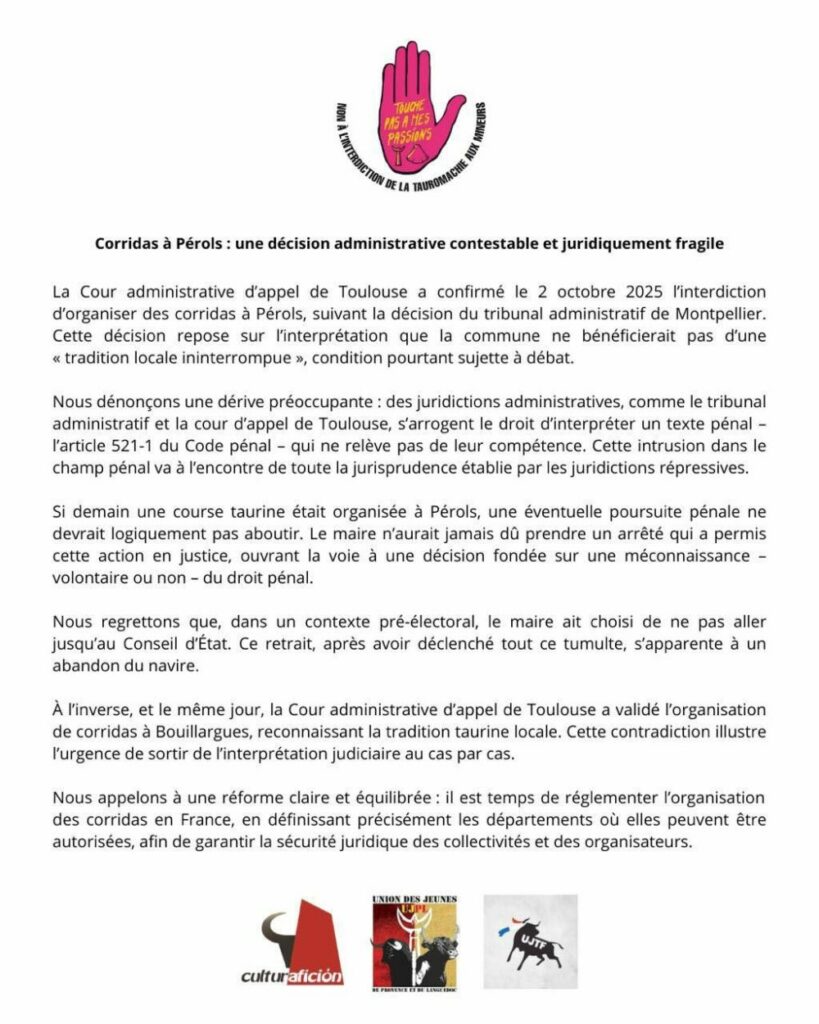Communiqué de l’Observatoire National des Cultures taurines à propos des termes sur la tradition locale interrompue pour les communes de Pérols et Bouillargues…