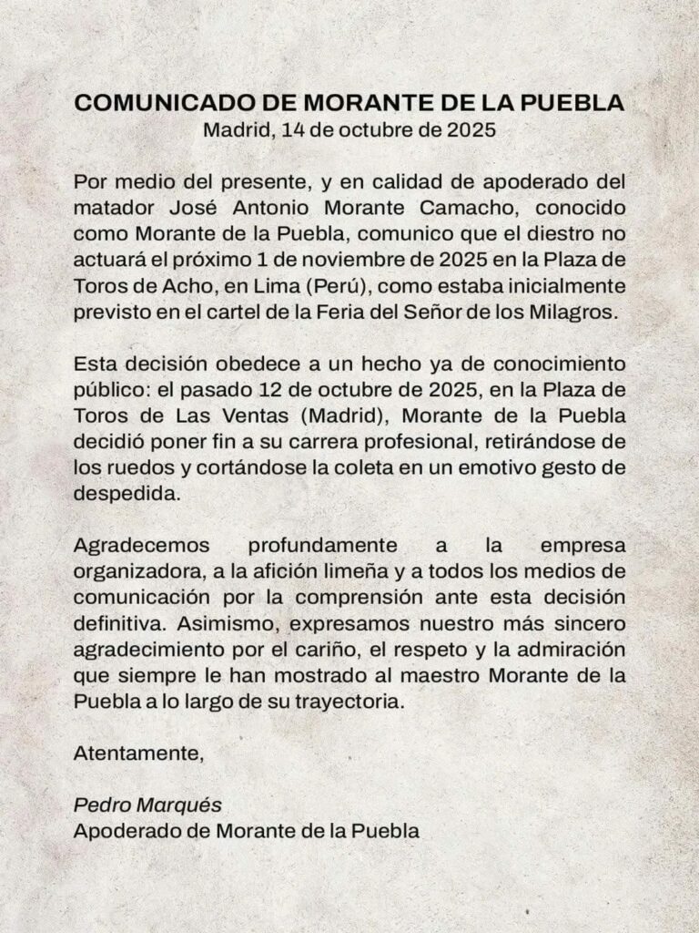 Par la présente, Pedro Marqués, représentant de José Antonio Morante Camacho, connu sous le nom de Morante de la Puebla, informe que le maestro effectuera sa dernière corrida le 1er novembre 2025, dans la Plaza de Toros de Acho, à Lima (Pérou), à l’occasion de la Feria del Señor de los Milagros.
