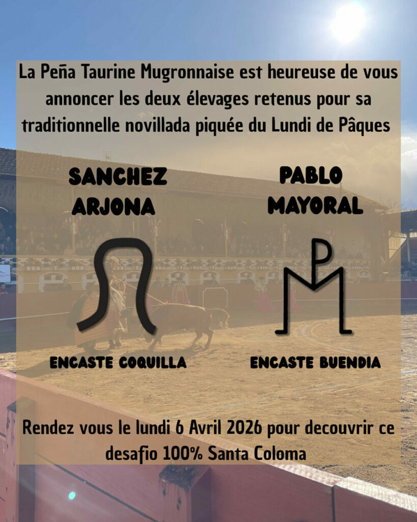 xLe Club taurin mugronnais vient d’annoncer de sa traditionnelle corrida du lundi de Pâques. Une corrida sous la forme d’un défi d’élevage 100% Santa Coloma, qui sera représenté par la devise de Salamanque de Sánchez Arjona (Vía Coquilla) et la devise d’Estrémadure de Pablo Mayoral (Vía Buendía).Rendez-vous le Lundi 6 Avril 2026 à 16h30 pour ce premier défi ganadero de l’histoire des arènes de Mugron.