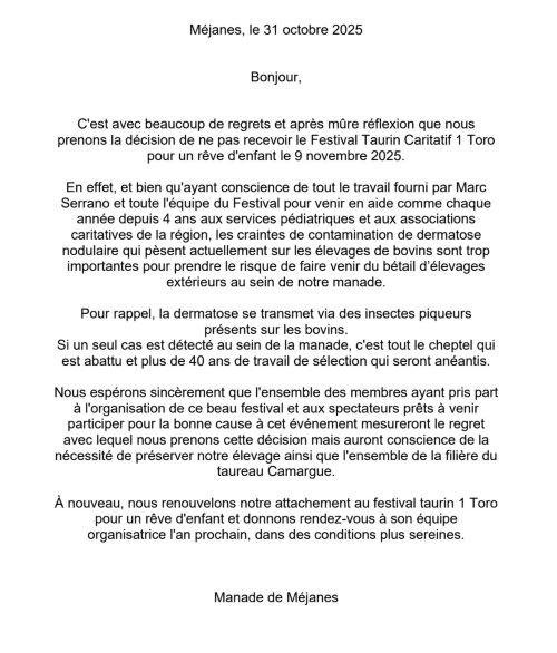 Annulation de la Journée Taurine Solidaire de Méjanes du 9 novembre « Un toro pour un rêve d’enfant »…