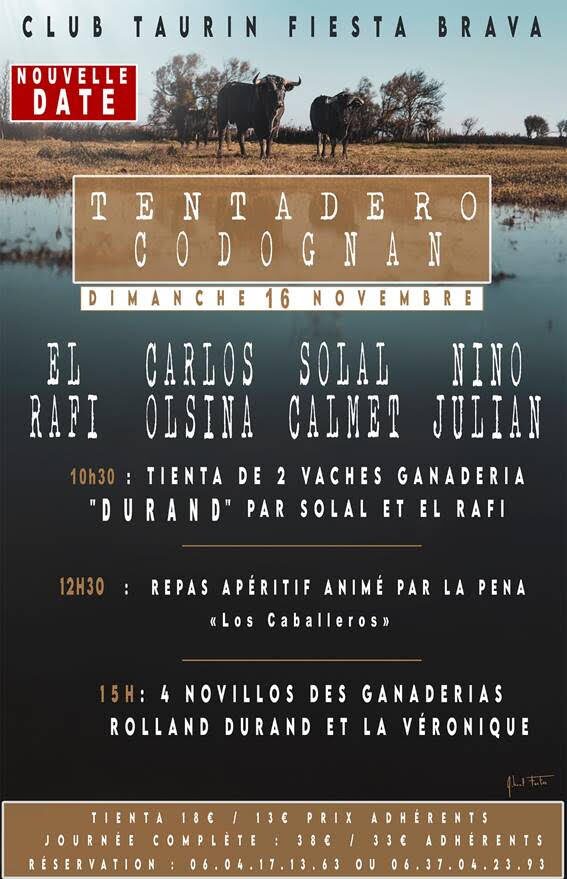 Comme vous le savez, l’arrêté ministériel du 17 octobre a perturbé nos agendas de fin de temporada, et notamment notre évènement taurin organisé par le CLUB TAURIN FIESTA BRAVA Nous vous informons que la journée de Tentadero initialement prévu le 02/11 a été reporté au 16 Novembre 2025 dans les arènes de Codognan.