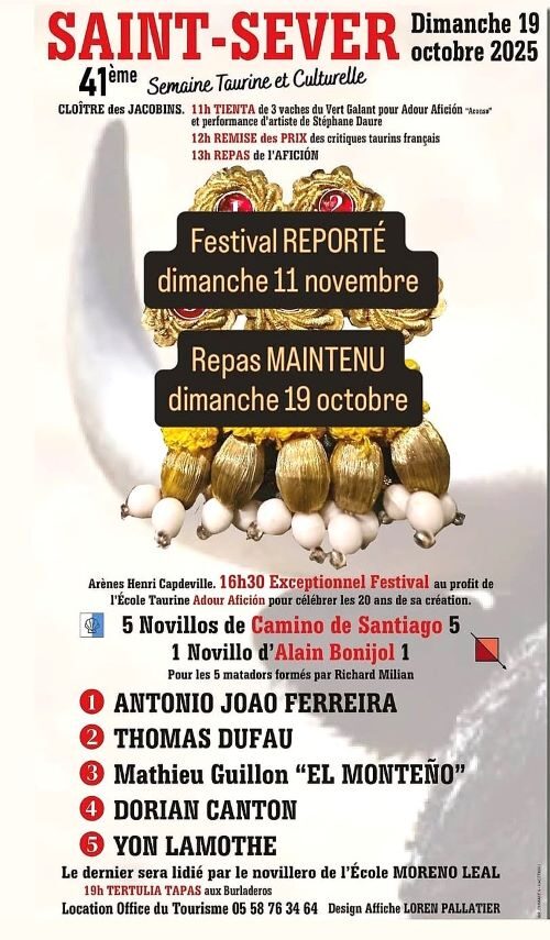 une tienta de « machos » étaient prévues dans les arènes de Béziers avec un cartel composé de Carlos Olsina, Victor et Clovis en raison de l’ interdiction d’organiser des spectacles taurins. Suite à un problème sanitaire détecté sur quelques bovins (« dermatose nodulaire contagieuse »), le Ministère de l’Agriculture a pris un arrêté interdisant tous les déplacements de bovins jusqu’au 4 novembre.